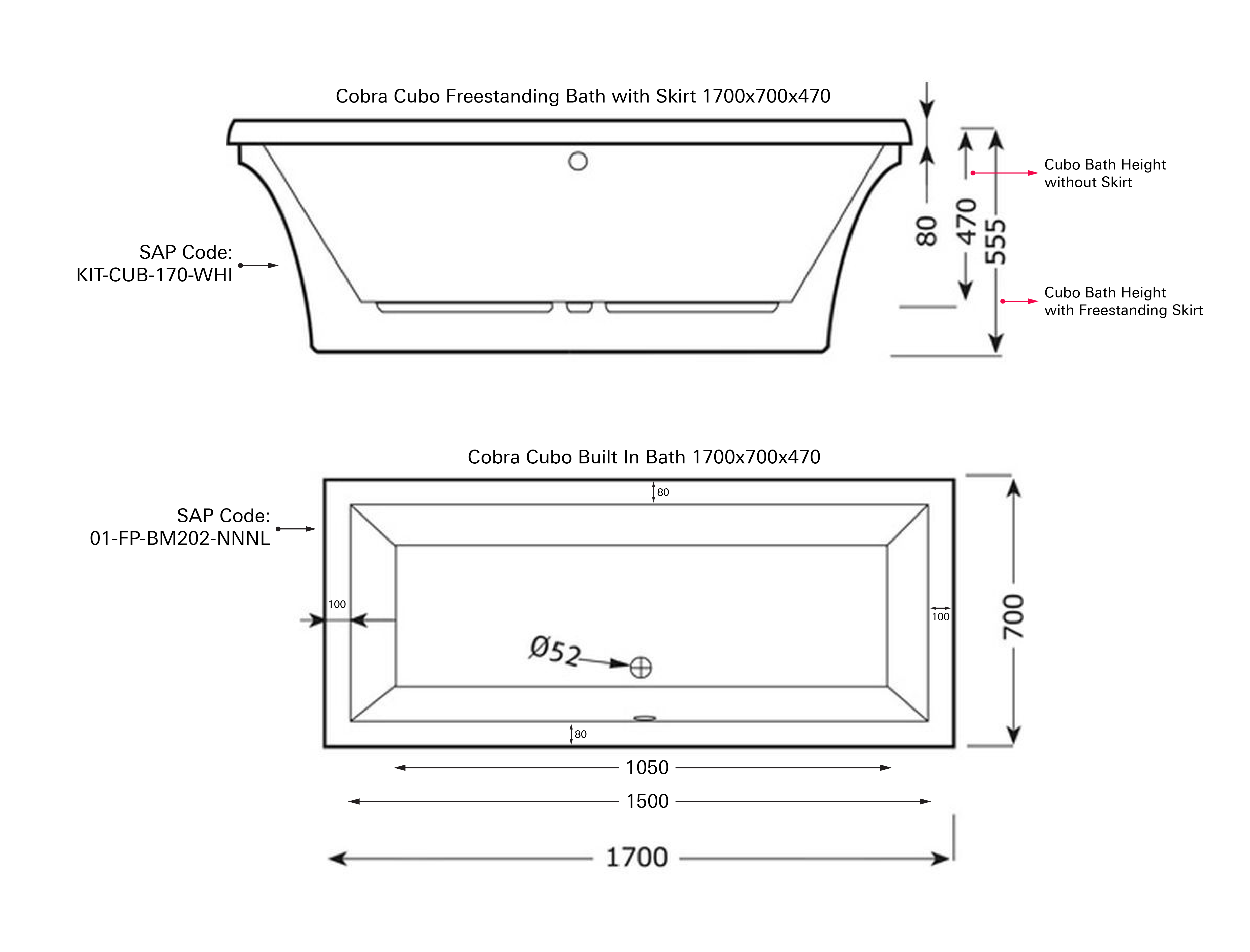 Cast acrylic, rectangular, centre waste, skirted bath. 1 700mm X 700mm X 470mm. Volume 170 litres. Package includes bath, skirt, foot kit, and waste pipe. Waste sold seperately.