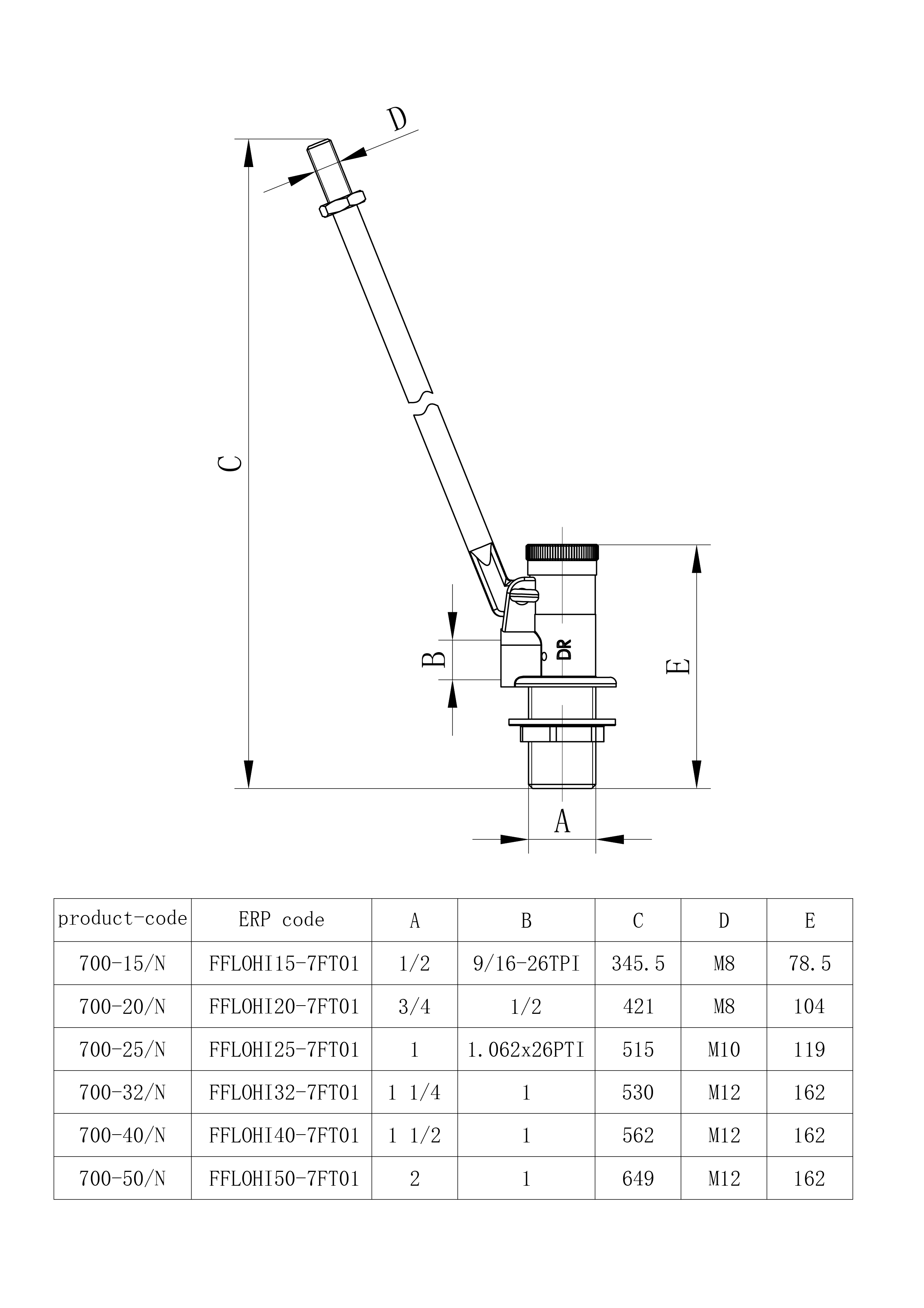 Float valve with side inlet, rough brass. Includes: high-pressure MOH pattern, 400mm long arm, piston, backnut, 11.1mm I.D. stainless steel seat, 50mm long inlet, and 1 1/4 male inlet.