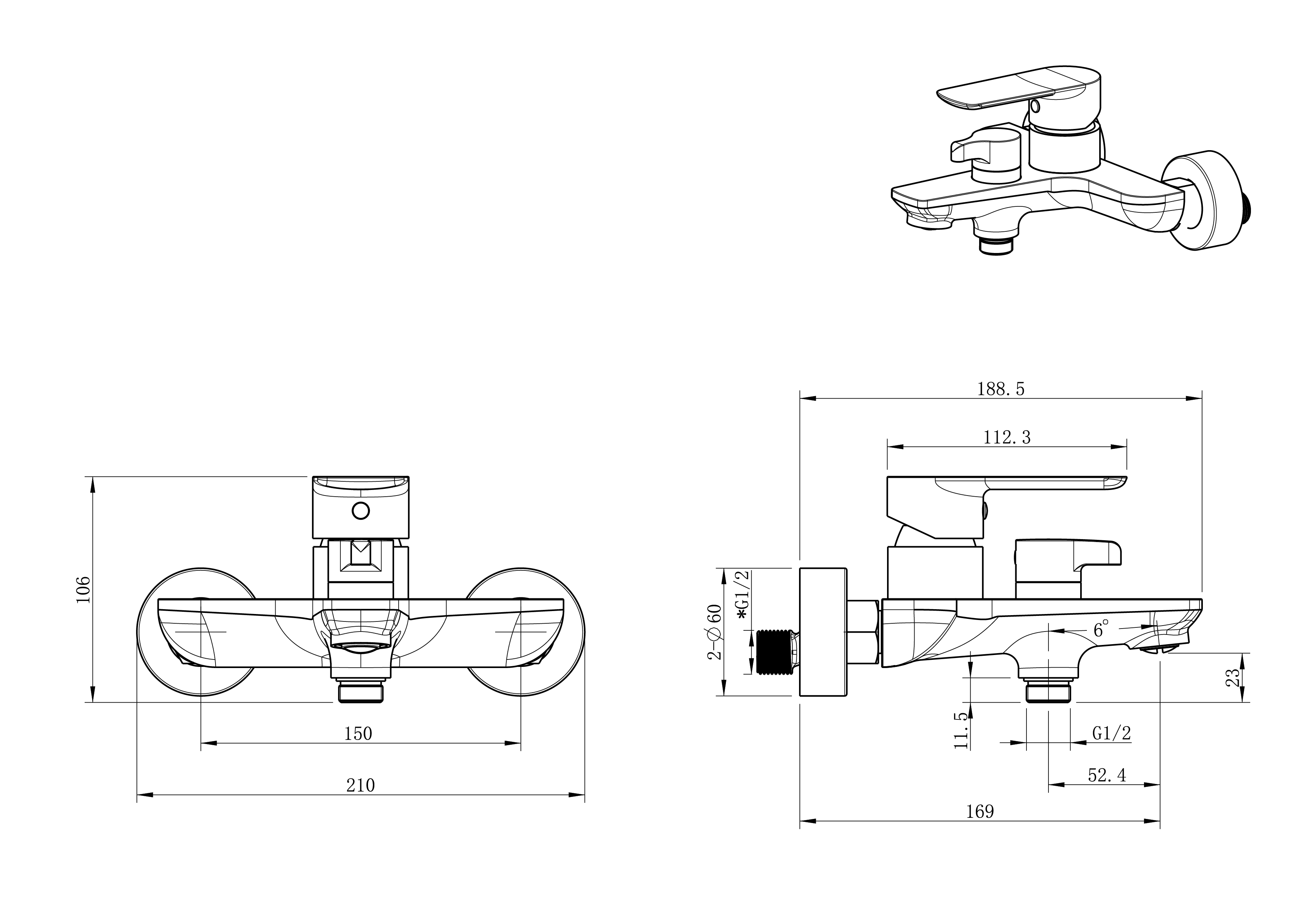 Seine single lever exposed bath mixer with diverter. Wall mounted, 2 hole. Manufactured with dezincification resistant (DZR) brass. SANS compliant chrome plated finish (nickel plating = 12.0µm; chrome plating = 0.3µm). 15mm connection ends. Fitted with Neoperl perlator. Hand shower & hose sold separately. Carries a 10 year warranty. Jaswic Approved Care & Maintenace - Ensure your product does not come into contact with any lubricants during installation. Chrome plated, matte black and any colour finshes should be wiped with warm soapy water and a soft cloth or sponge. Rinse, then dry and buff with a dry soft cloth. Under no circumstances must any detergents containing hydrochloric acids or abrasives including cream cleansers be used. Do not use abrasive cleaning materials such as scourers. Should your product have an aerator at the water outlet, it should be checked and cleaned regularly.