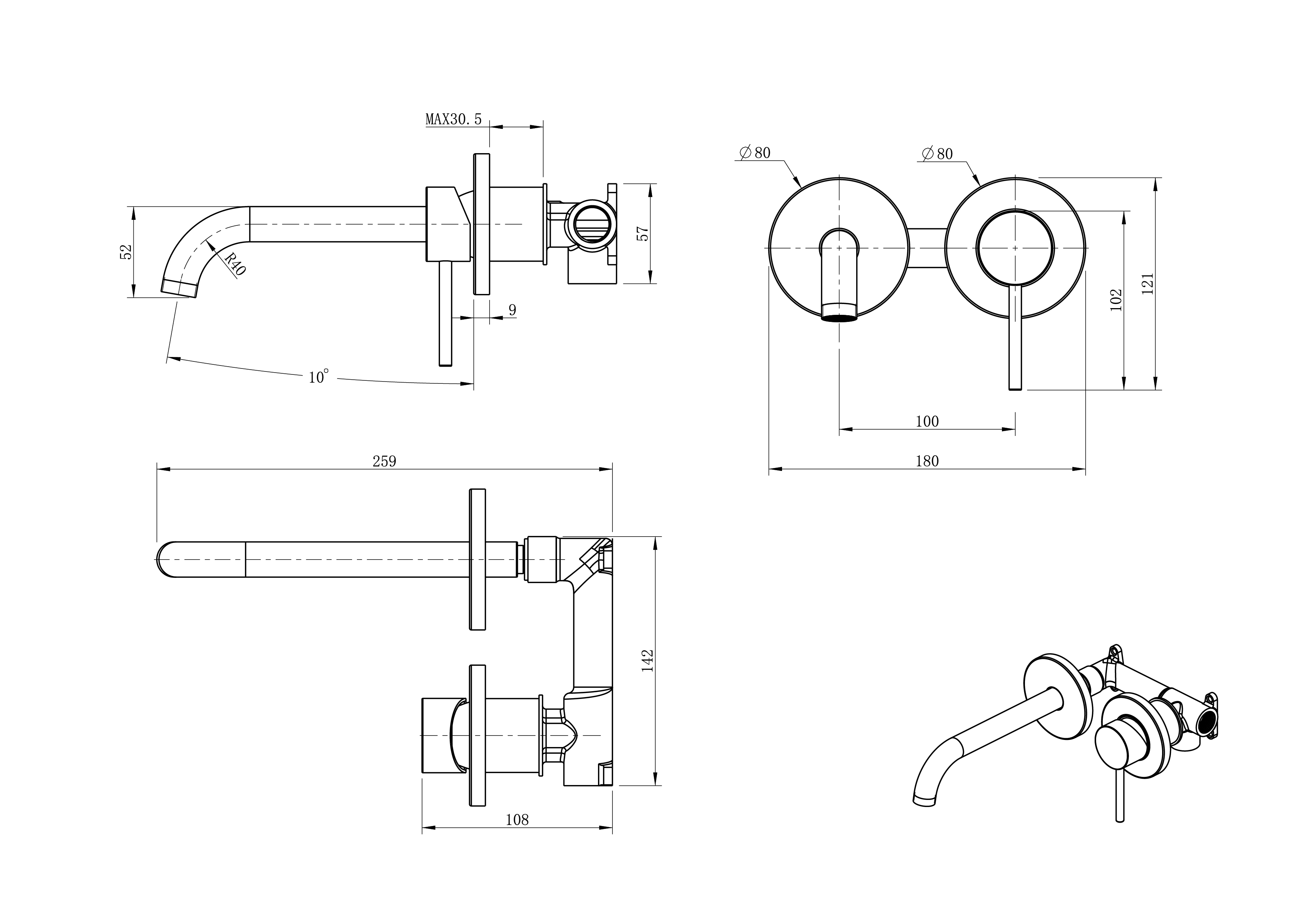 Cobra Tigris Basin Mixer Wall Type, 1/2 FI, Brass body, 35mm cartridge, Neoperl aerator core, Stainless Steel 201 outlet tube, Brass wall cover, Flow rate 7.98 l/min @300kPa, Brushed Nickel. Care & Maintenace - Ensure your product does not come into contact with any lubricants during installation. Chrome plated, matte black and any colour finshes should be wiped with warm soapy water and a soft cloth or sponge. Rinse, then dry and buff with a dry soft cloth. Under no circumstances must any detergents containing hydrochloric acids or abrasives including cream cleansers be used. Do not use abrasive cleaning materials such as scourers. Should your product have an aerator at the water outlet, it should be checked and cleaned regularly.