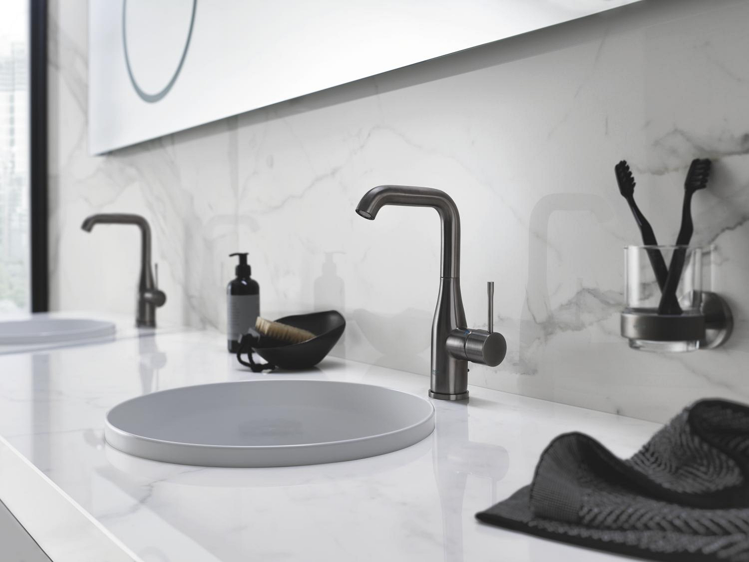 Sophisticated style and premium performance – the water-saving GROHE Essence Single-lever basin mixer with high swivel spout and pop-up waste in Brushed Hard Graphite - monobloc installation, metal lever, 28 mm ceramic cartridge , with GROHE SilkMove, with temperature limiter, GROHE Long-Life finish, GROHE Water Saving - Less water, perfect flow, maximum flow rate (at 3 bar): 6.5 l/min, GROHE AquaGuide adjustable mousseur, GROHE FastFixation Plus installation system, swivel spout with mousseur , and stop limiter, pop-up waste set 1 1/4", flexible connection hoses