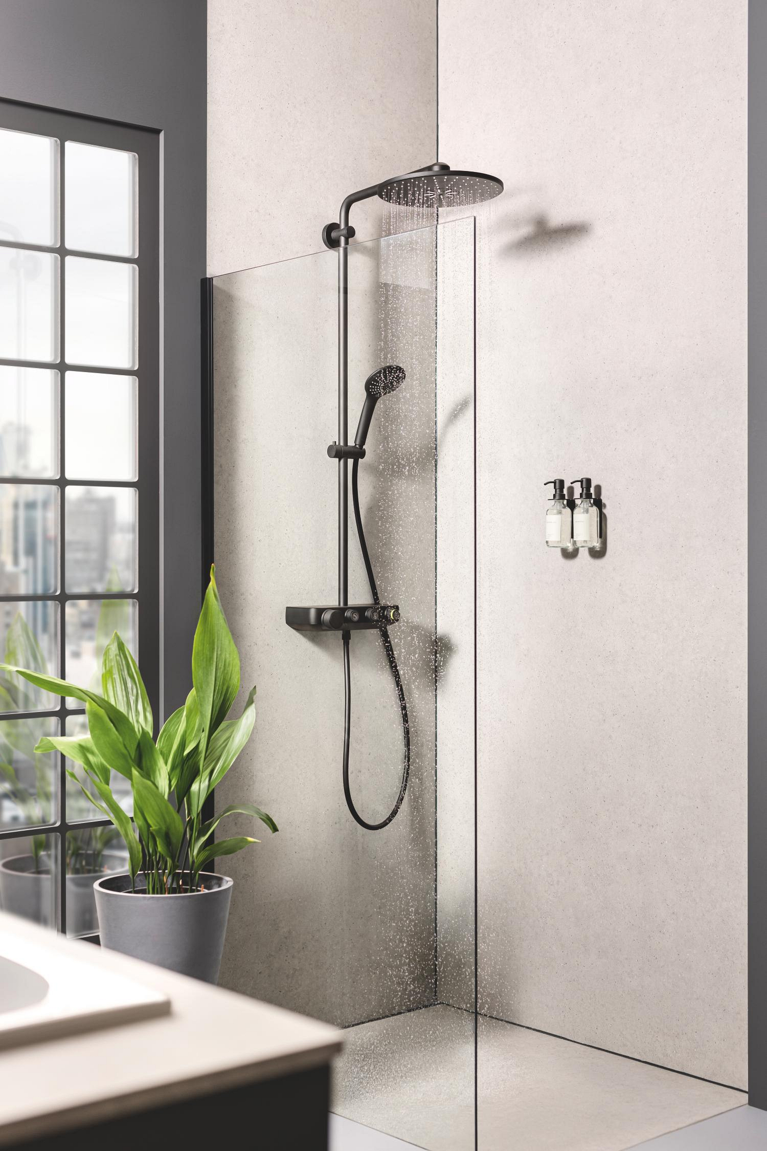The GROHE Euphoria SmartControl 310 Shower system in eye-catching phantom black – perfect proportions conceal premium performance and control - Consisting of:, horizontal 450 mm shower arm, upper bracket adjustable for minimal adaption to existing drilling holes, exposed SmartControl thermostat, allows change between:, head shower Rainshower SmartActive 310, spray patterns: GROHE PureRain, ActiveRain, hand shower Euphoria 110 Massage, spray plate phantom black, spray patterns: Rain, SmartRain, Massage, maximum flow rate (at 3 bar): 16 l/min, adjustable height via gliding element, Silverflex shower hose 1750 mm 1/2" x 1/2" (28 388 000), GROHE DreamSpray perfect spray pattern, GROHE CoolTouch prevents scalding on hot surfaces, GROHE TurboStat compact cartridge with wax thermoelement, GROHE ProGrip with knurl structure, GROHE SafeStop safety button at 38°C, GROHE SafeStop Plus optional temperature limiter at 43°C included, GROHE SmartControl push for ON-OFF, turn for volume adjustment from GROHE Water Saving to Full Flow, integrated GROHE EasyReach shower tray, SpeedClean anti-limescale system, Inner WaterGuide for a longer life, TwistStop preventing the hose from twisting, suitable for instantaneous heaters from 18 kW/h, minimum flow rate 5 l/min.