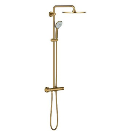 Designer style meets showering luxury – the GROHE Euphoria XXL thermostatic shower system with 3-spray hand shower in Brushed Cool Sunrise - Consisting of:, horizontal swivable 450 mm projection shower arm, exposed thermostatic shower, with Aquadimmer function, allows change between:, Rainshower Cosmopolitan 310 metal head shower, Rain spray pattern, with ball joint, rotation angle ± 15°, hand shower Euphoria 110 Massage, spray patterns: Rain, Massage, SmartRain, maximum flow rate (at 3 bar): 13.5 l/min, adjustable height via gliding element, Silverflex shower hose 1750 mm 1/2" x 1/2" (28 388 000), GROHE TurboStat compact cartridge with wax thermoelement, GROHE SafeStop safety button at 38°C, (calibration required), GROHE SafeStop Plus optional temperature limiter at 43°C included, GROHE MetalGrip ergonomically shaped metal handles, GROHE DreamSpray perfect spray pattern, GROHE LongLife finish, GROHE SprayDimmer (Stepless , flow rate reduction), Inner WaterGuide for a longer life, GROHE SpeedClean effortless limescale removal, TwistStop preventing the hose from twisting, suitable for instantaneous heaters from 18 kW/h, minimum flow rate 5 l/min., optional upgrade: GROHE EasyReach tray (26 362)