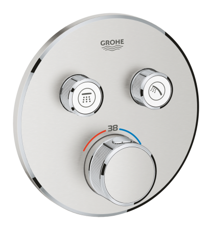 Change the way you interact with your bath or shower with the precise operation of the Grohtherm SmartControl thermostat for concealed installation - set for final installation for, GROHE Rapido SmartBox 35 600/35 604, metal wall escutcheon with GROHE FastFixation (covered escutcheon, and shaft sealing, covered fixing), retroactively 6° adjustable, GROHE Long-Life finish, GROHE SmartControl push for ON-OFF, turn for volume adjustment from GROHE Water Saving to Full Flow, exchangeable symbols, GROHE TurboStat compact cartridge with wax thermoelement, GROHE SafeStop safety button at 38°C, (calibration required), GROHE SafeStop Plus optional temperature limiter at 43°C or 46°C included, built-in non return valve , and dirt strainers, multiple outlets can be run simultaneously, without roughing-in-set, flow performance: , outlet B = 24 l/min , outlet C = 26 l/min, outlet B+C = 29 l/min