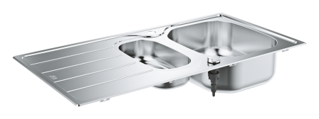 model: K200 60-S 96.5/50 1.5 rev mounting type: top mount material: stainless steel AISI 304 (V2A) material thickness: 0.7 mm GROHE Long-Life Shine finish finish: satin finish GROHE Whisper min. cabinet size: 600 mm dimensions: 965 x 500 mm 1 bowl: 346 x 396 x 150 mm 1 bowl: 170 x 320 x 80 mm outer radius: R10 (topmount), inner bowl radius: R100 GROHE FastFixation installation system sink mountable left or right cut-out (top mount): 941 x 476 mm drilling holes: 2 x 35 mm waste: Ø 3.5"/90 mm waste strainer with automatic waste fitting accessories included: automatic waste fitting with rotary handle,waste kit, basket strainer waste, mounting set optional push to open excenter (40 986 SD0) amount of fasteners included (top mount): 16