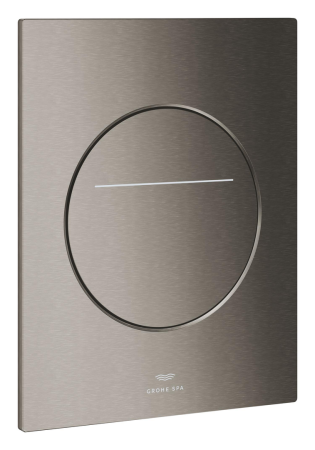 The stylish GROHE Arina flush plate in brushed hard graphite – cutting-edge functionality and eco-conscious performance - for dual flush actuation, for pneumatic drop valve AV1, for vertical installation, 160 x 201 mm, material: ABS, GROHE Long-Life finish, GROHE Water Saving - Less water, perfect flow, for combination with Rapid SL and Uniset with GD 2 cistern, slim cistern and 80 mm cistern, 6V lithium battery, type CR-P2, battery lifetime: 4 years for a 3 person household (approx. 17000 actuations), battery status warning, auto flush, cleaning mode, for mains supply please order transformer 100 686 9990