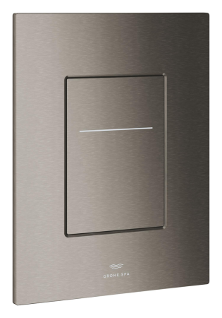 The GROHE Arina flush plate in stylish brushed hard graphite – sophisticated slimline performance - for dual flush actuation, for pneumatic drop valve AV1, for vertical installation, 160 x 201 mm, material: ABS, GROHE Long-Life finish, GROHE Water Saving - Less water, perfect flow, for combination with Rapid SL and Uniset with GD 2 cistern, slim cistern and 80 mm cistern, 6V lithium battery, type CR-P2, battery lifetime: 4 years for a 3 person household (approx. 17000 actuations), battery status warning, auto flush, cleaning mode, for mains supply please order transformer 100 686 9990